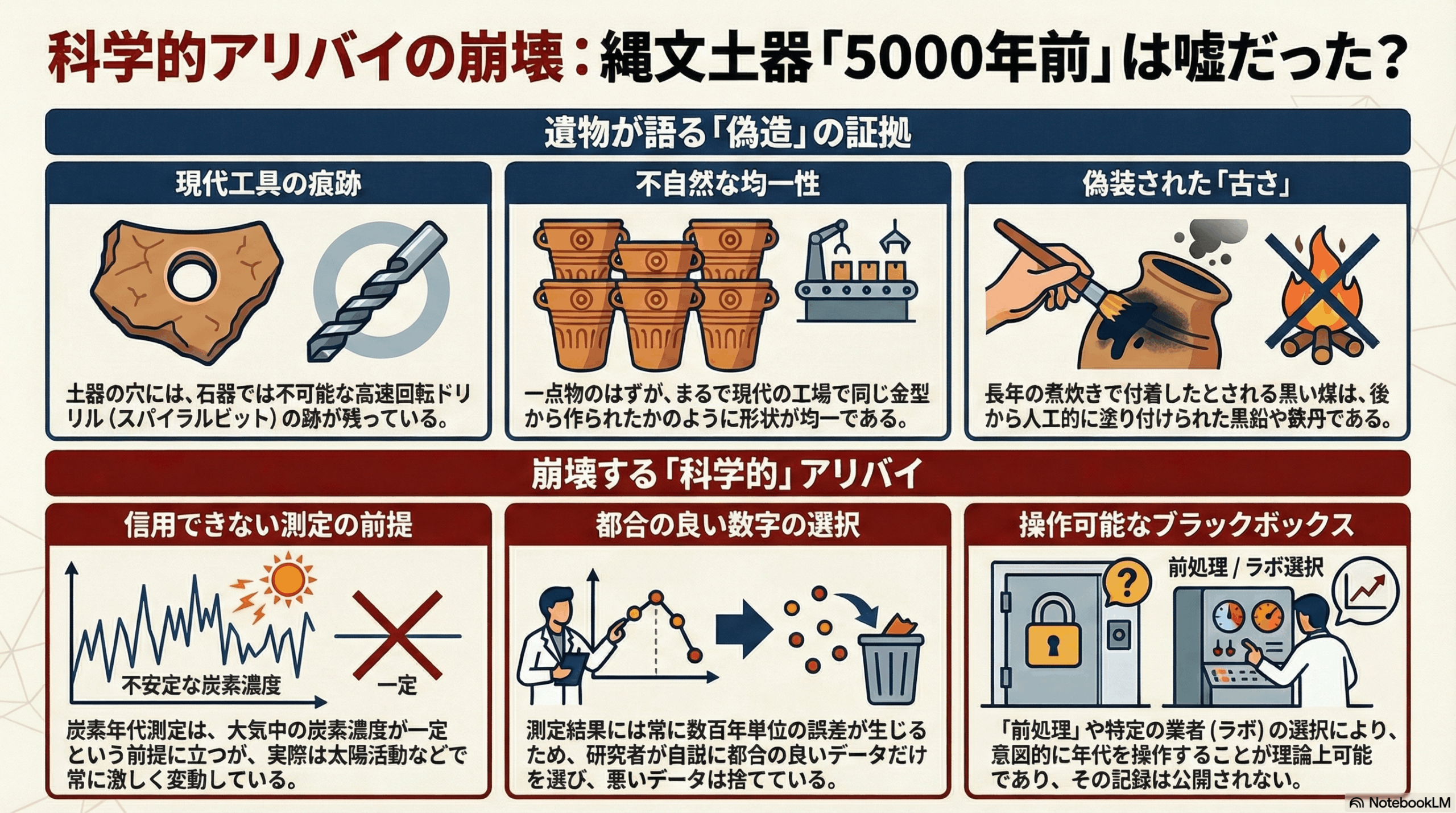 - 操作可能なブラックボックス: 「前処理」と呼ばれる試料の洗浄工程や、測定を依頼する「ラボ」の選定によって、年代を意図的に操作することが可能だと暴露。依頼者とラボが結託すれば、どんな現代の品物でも数万年前の結果を出すことが理論上可能であり、その詳細な記録が外部に開示されることはないと述べています。