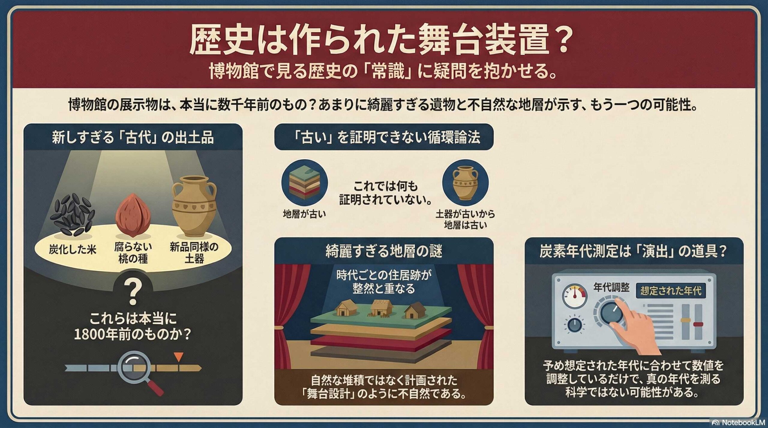 博物館で語られる歴史は、過去の事実を積み重ねたものではなく、近代国家がその正当性を補強するために構築した「脚本」である可能性があります。炭化米、地層、炭素年代測定といった「証拠」は、その脚本を科学的に見せかけるための「舞台装置」や「小道具」に過ぎないのかもしれません。