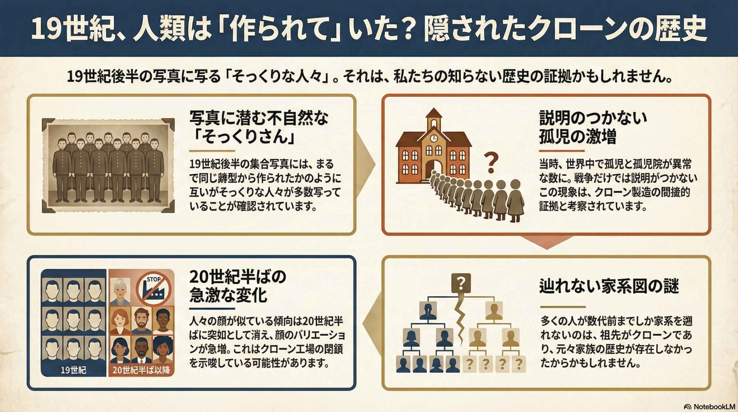 本動画は、エジプトの遺跡を単なる王の墓ではなく、過去の超文明による「クローン製造工場」と捉え直すことで、19世紀の人口爆発や孤児問題といった歴史の謎に迫る大胆な仮説を提示しています。壁画に描かれた奇妙な存在や「松ぼっくり」は、その製造プロセスを示す証拠なのかもしれません。