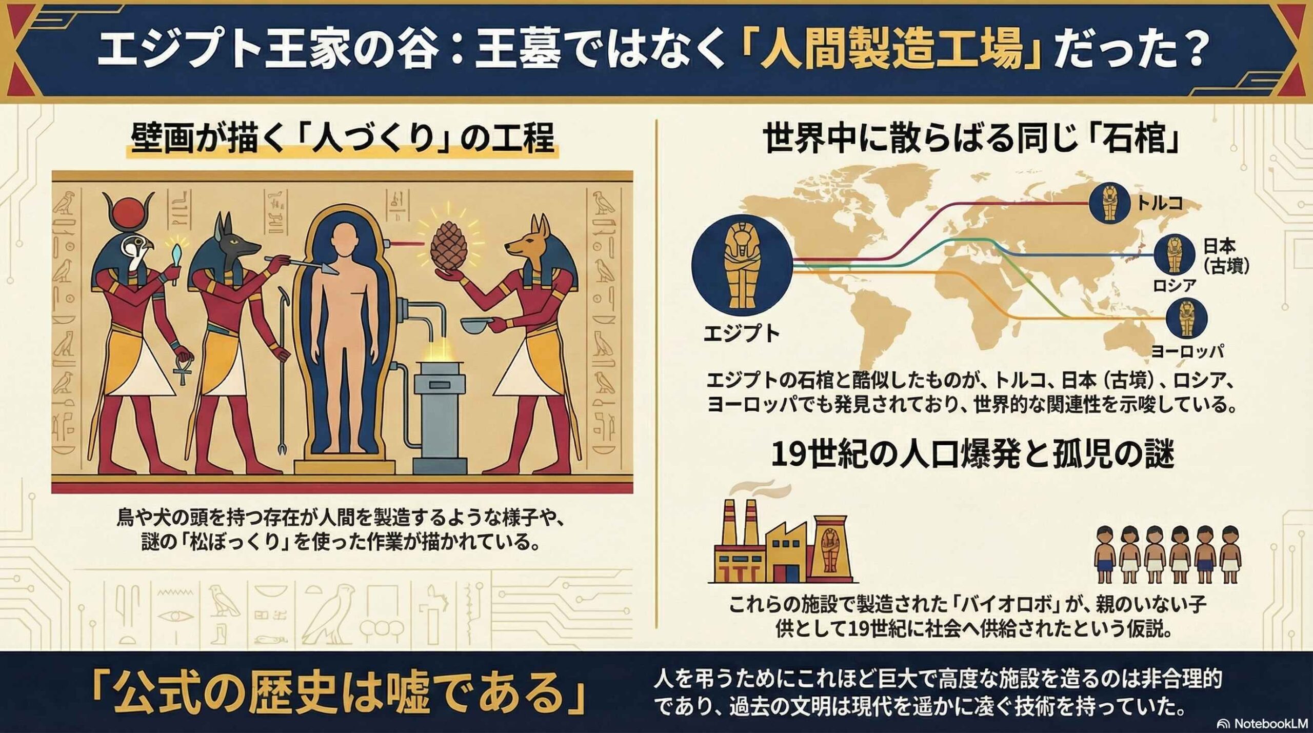 本動画は、エジプトの王家の谷を「古代のクローン製造工場」と見なし、壁画や世界中に散らばる類似の遺跡をその証拠として提示しています。通説では説明のつかない19世紀の人口爆発や孤児の増加といった歴史の謎に、新たな光を当てる刺激的な仮説です。