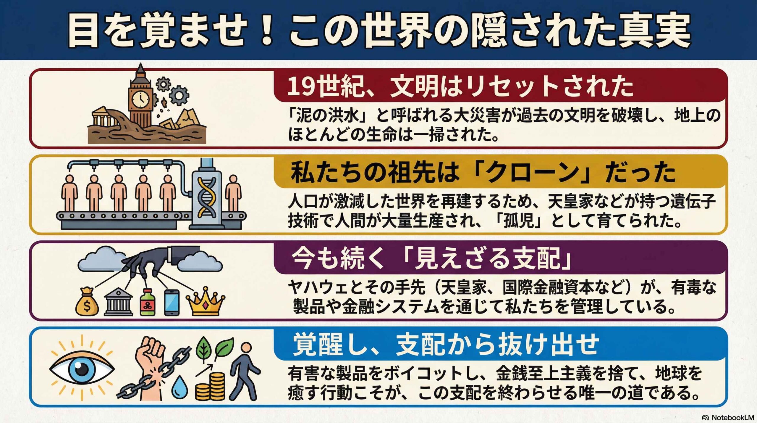 この時、圧倒的に不足していた労働力を補うため、人間が人工的に「生産」されたのではないか、というのが本動画の核心です。特に日本は、古代レムリア・ムー文明から受け継いだ高度な遺伝子工学・クローン技術を保持しており、天皇家がその中心となって人間製造を主導したとされています。明治時代に孤児が急増した背景には、このような人為的な人口供給があったと指摘しています。