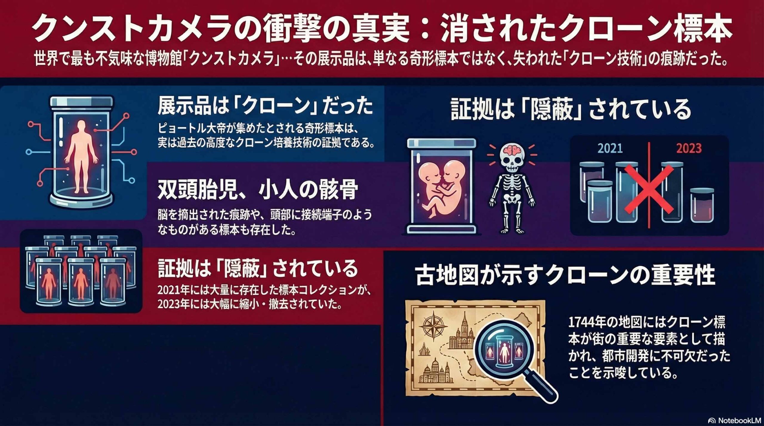 サンクトペテルブルクに存在する「クンツカメラ」は、世界で最も不気味な博物館として知られています。公式にはピョートル大帝がヨーロッパから収集した奇形や解剖学の標本とされていますが、動画ではこれらの展示物が、我々の知らない過去の「クローン研究」の痕跡であると考察しています。